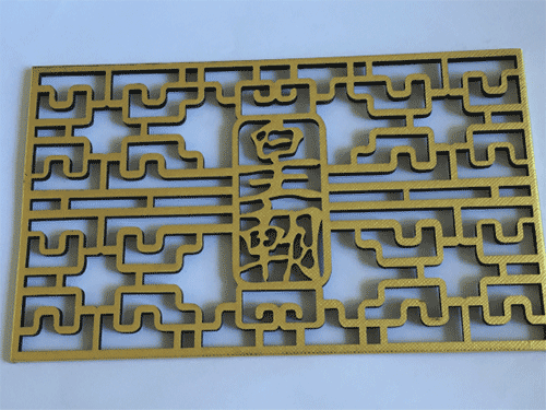 4. 將產品正麵朝上放置在切割機上,金鉑紙麵為正麵(miàn),要求(qiú)不能有白邊,發黃,發黑等現象,激光鏤空後用汽槍將灰塵吹(chuī)幹淨,不能吹太重。生產首件交由品管確認OK後再進行批量生產。